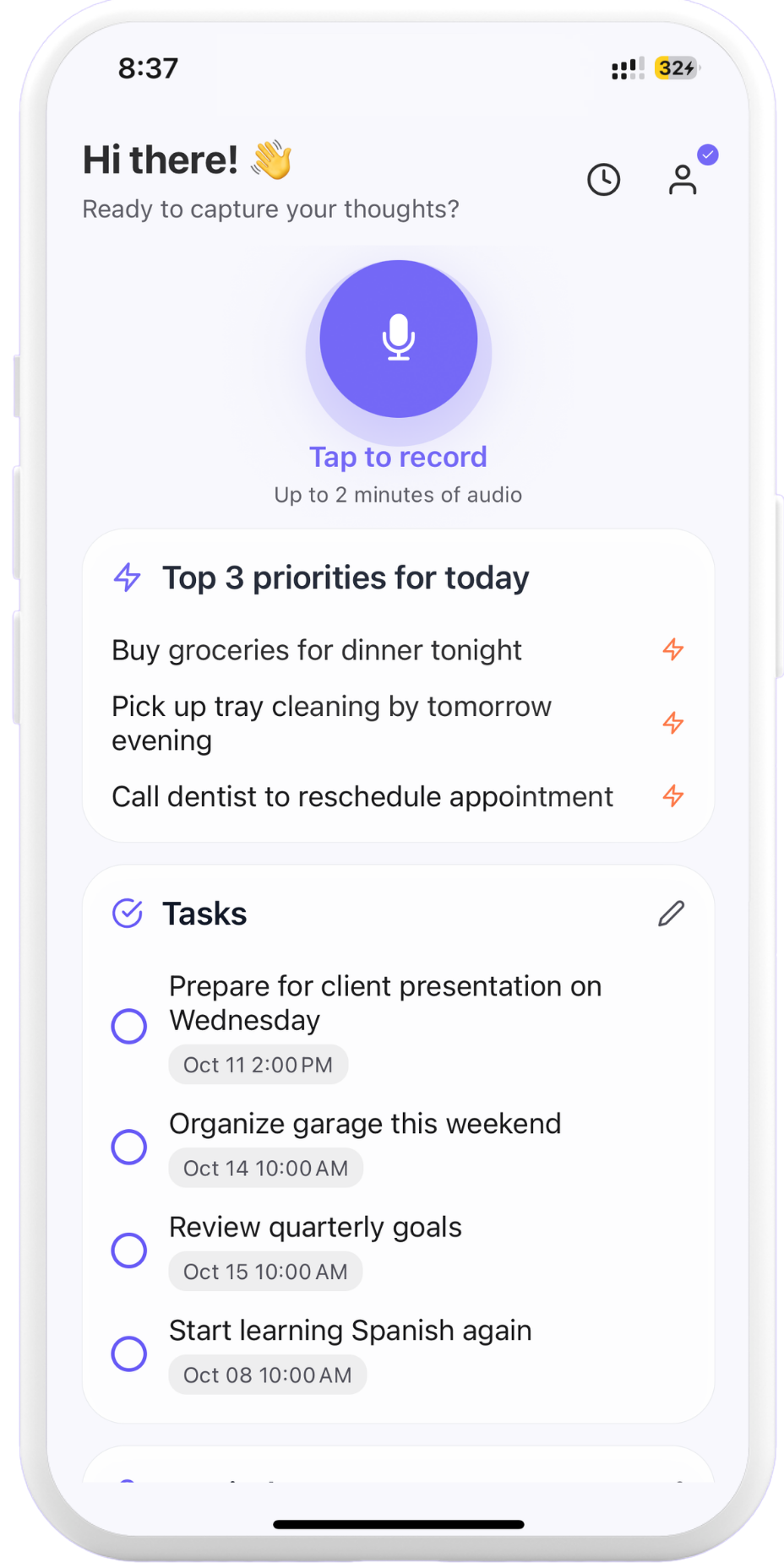 Free: 30 brain dumps, Top-3 widget, offline recording, calendar export.